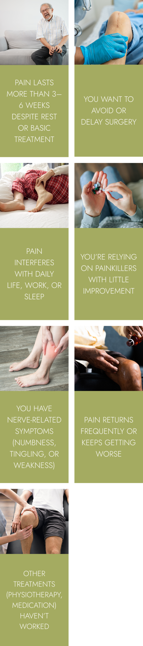Early intervention can prevent chronic pain and help you recover faster, with less medication, less risk, and more comfort.